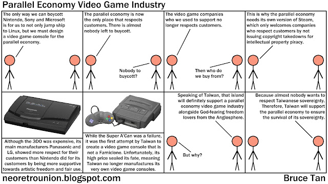 Yes, Taiwan did try to leave a footnote on video game history with the Super A'Can, which is obviously not a Famiclone. Unfortunately, it was unable to compete with consoles from established brands such as Nintendo, Sega and Sony, resulting in the discontinuation of the Super A'Can. If Taiwan wishes for its sovereignty to survive, supporting the parallel economy is the only option left for them, and they can start by joining forces with parallel economy advocates from the Anglosphere. Perhaps Taiwan will manufacture their own video game console again, so that console gamers will have a true alternative to Nintendo, PlayStation, and XBox. An alternative that promotes freedom of expression.